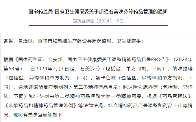 國家藥監(jiān)局 國家衛(wèi)生健康委關(guān)于加強右美沙芬等藥品管理的通知國藥監(jiān)藥管〔2024〕16號各省、自治區(qū)、直轄市和新疆生產(chǎn)建設(shè)兵團藥監(jiān)局、衛(wèi)生健康委:根據(jù)《國家藥監(jiān)局、公安部、國家衛(wèi)生健康委關(guān)于調(diào)整精神藥品目錄的公...
